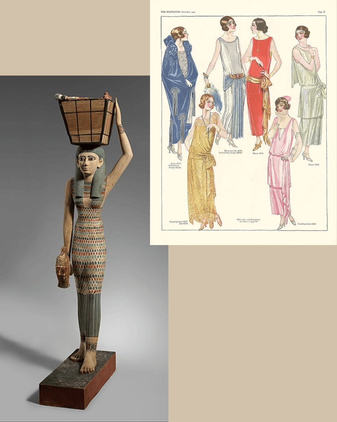 European fashion taking inspiration from Ancient Egypt is nothing new. During the Regency era, as Napolean conquered Alexandria and Cairo, geometrical embroidery from Egypt became all the rage. In 1869, the creation of the Suez Canal saw the rise of jewelry in the form of sphinxes and scarabs.